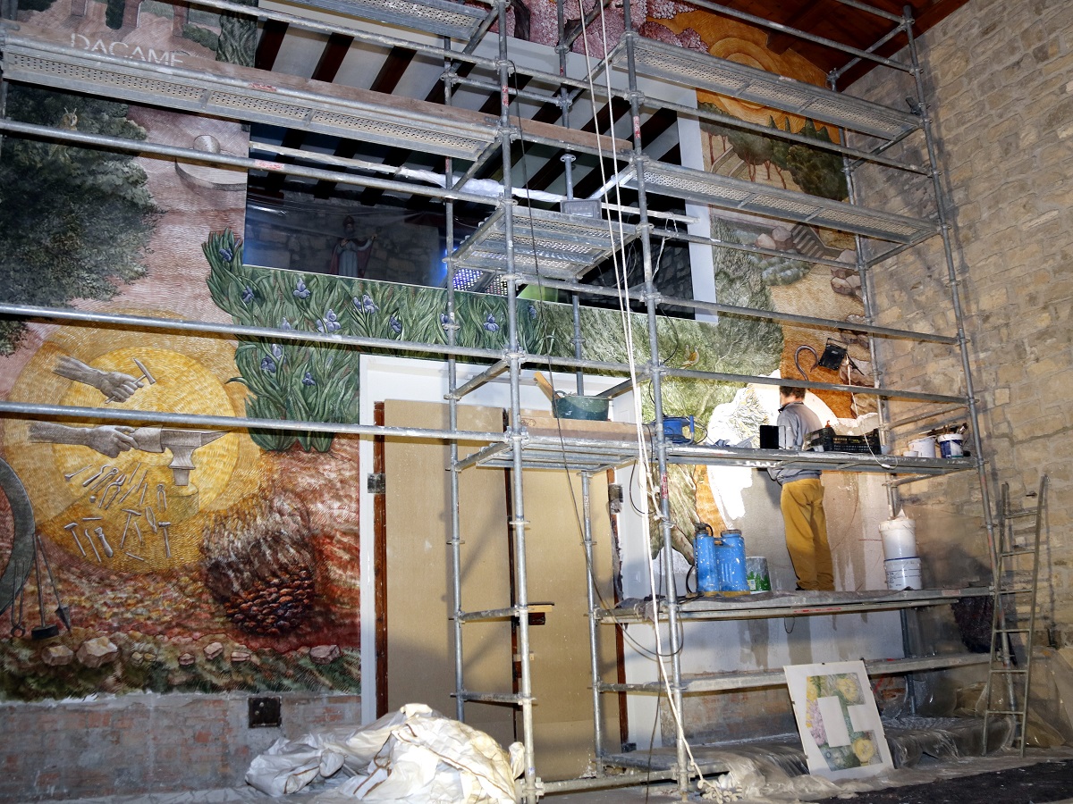 El mural té una superfície de 34 metres quadrats, 7,48 metres d’alçada i 7,50 metres d’amplada. Emmarca el portal d’entrada i la balconada del cor. S’hi representen la bellesa de la natura i la creació del parc de Sant Eloi com una acció de respecte i de goig de la naturalesa, així com els atributs de Sant Eloi, representats d’una manera simbòlica a través de mans.