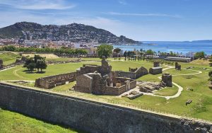 3– Castrum Visigòtic. Ubicat al cim del Puig Rom, a uns 230 metres sobre el nivell del mar, era un poblat fortificat erigit al segle VII dC, que constava de dues torres quadrangulars i una muralla amb doble mur. Les restes són d’un gran valor arqueològic i des d’ell es gaudeix d’una altra vista panoràmica espectacular de Roses i la seva badia.
