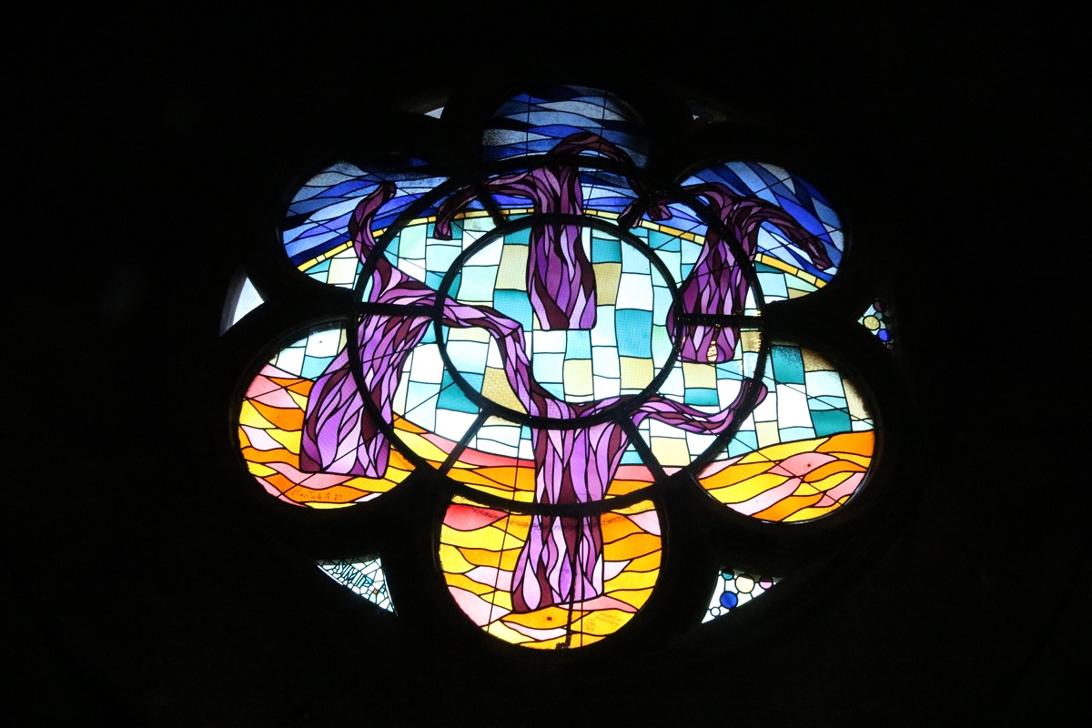 Plantalech mai havia dissenyat un vitrall, i explica que va assumir el repte inspirant-se tant en el mateix temple com en d’altres de gran envergadura, com la Sagrada Família. En el procés creatiu s’hi va sumar l’obra ‘La Danse’, d’Henri Matisse, on diverses figures ballen damunt una bola del món. Amb tots aquests elements, l’artista va idear el vitrall sota el títol ‘L’alegria de viure’. Des de la comissió del temple li van demanar que l’obra lluís elements penedesencs, així que va triar els ceps com a protagonistes.