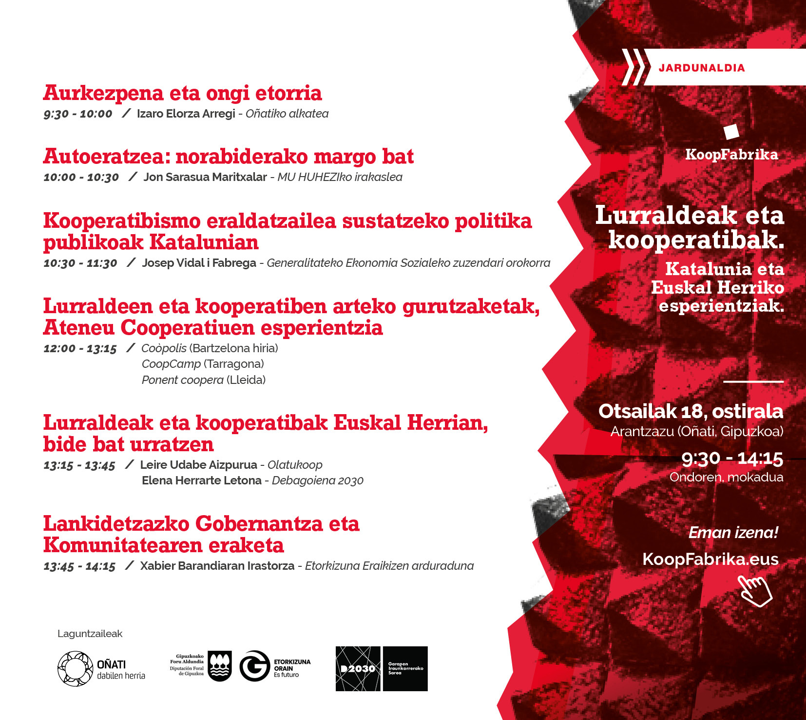 El 18 de febrer tindrà lloc, a Arantzazu (Biscaia), la jornada “Territoris i cooperatives; experiències catalanes i basques”, organitzada pel projecte KoopFrabrika amb l’objectiu de donar a conèixer a Euskal Herria les polítiques públiques innovadores que la Generalitat de Catalunya impulsa d’uns anys cap aquí i, a la vegada, reflexionar sobre el desenvolupament de models propis de promoció d’aquestes lògiques al País Basc. La jornada del dia 18 serà la culminació de tres dies de visites del món cooperatiu català i, més concretament, de la Direcció General d’Economia Social i Solidària, el Tercer Sector i les Cooperatives i representants dels Ateneus Cooperatius, a diversos projectes d’economia social de Navarra i el País Basc.