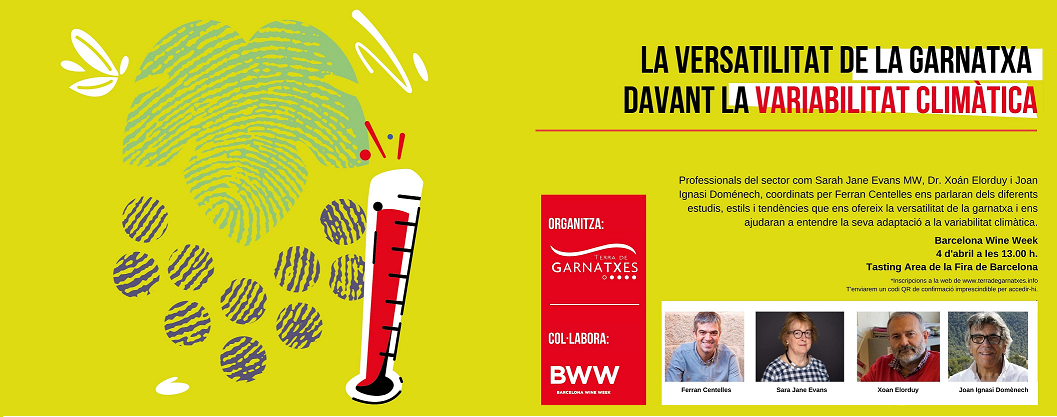 La conferència La versatilitat de la Garnatxa davant de la variabilitat climàtica és el primer d’aquests esdeveniments. Una trobada on professionals del sector com ara la Master of Wine britànica, Sara Jane Evans; Xoán Elorduy, responsable tècnic de l’Observatori de la vinya, el vi i el cava de l’INCAVI; i Joan Ignasi Domènech, propietari del celler Vinyes Domènech, debatran sobre els diferents estudis, estils i tendències que ens ofereix la garnatxa, i ens ajudaren a entendre la seva versatilitat i adaptació als climes canviants. I tot coordinat i moderat pel sommelier Ferran Centelles. L’acte se celebrarà dilluns 4 d’abril (13h) a la Tasting Area de la Barcelona Wine Week.