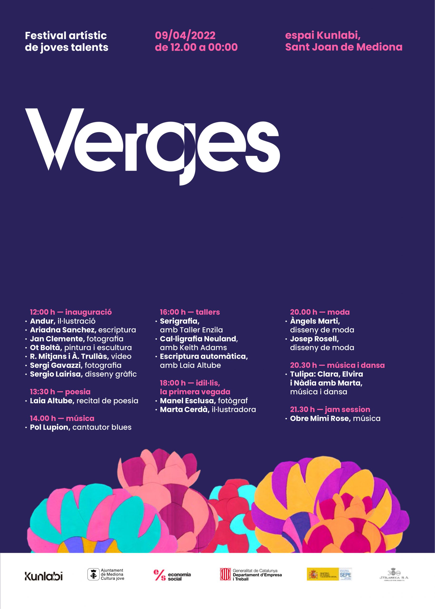 Els disset joves que participen al festival tenen entre 15 i 25 anys, provenen de disciplines diverses i tots ells tenen en comú el fet de no haver exposat ni presentat mai la seva obra. De fet, la iniciativa d’impulsar Verges neix a partir de la inquietud d’alguns d’aquests talents locals per poder exposar a l’espai Kunlabi i ha anat madurant afegint-hi l’acompanyament de l’estudi de disseny quant a la manera com concebre i produir l’exposició, sumant la implicació de l’Ajuntament assumint els costos de producció, i ampliant la participació a joves de diferents punts del país. Tot plegat, ha desembocat en un festival que entre dotze del migdia i dotze de la nit programarà a més de la mostra artística, tallers, xerrades, actuacions i concerts i que comptarà també amb un espai gastronòmic. En definitiva, una proposta concebuda per promoure el talent jove però oberta a tot el públic.