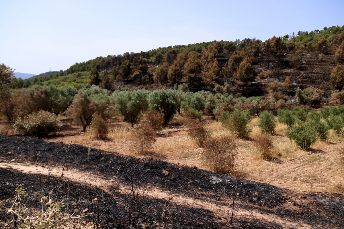 Les soques encara fumegen a la vall dels Vilaverds del terme municipal de Corbera d’Ebre. L’estampa de negror de les zones boscoses contrasta amb les dels camps d’oliveres i ametllers que no s’han cremat. A primera hora d’aquest matí, el cos de bombers ha autoritzat als propietaris afectats a entrar la zona després de donar per estabilitzat el foc. “Ho he vist tot cremat, una cosa devastadora, per sort la meva finca no s’ha vist afectada, però hi ha molts viticultors i pagesos que estan afectats; és una desgràcia”, ha afirmat González.
