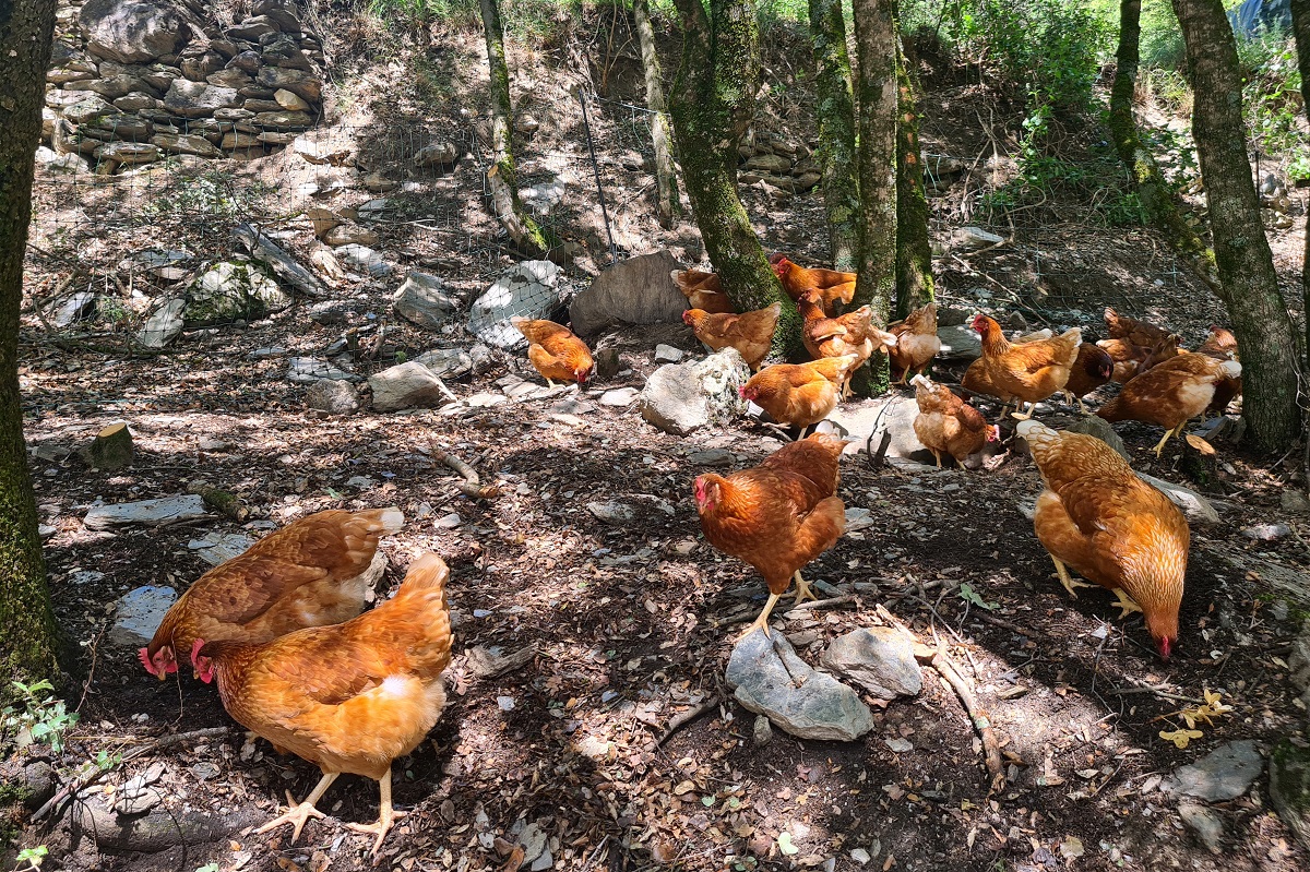 Les gallines estan a l’aire lliure dins un tancat electrificat per evitar danys de la fauna salvatge. Junt amb les gallines hi viuen dos gossos de protecció que eviten la presència de qualsevol altre animal.