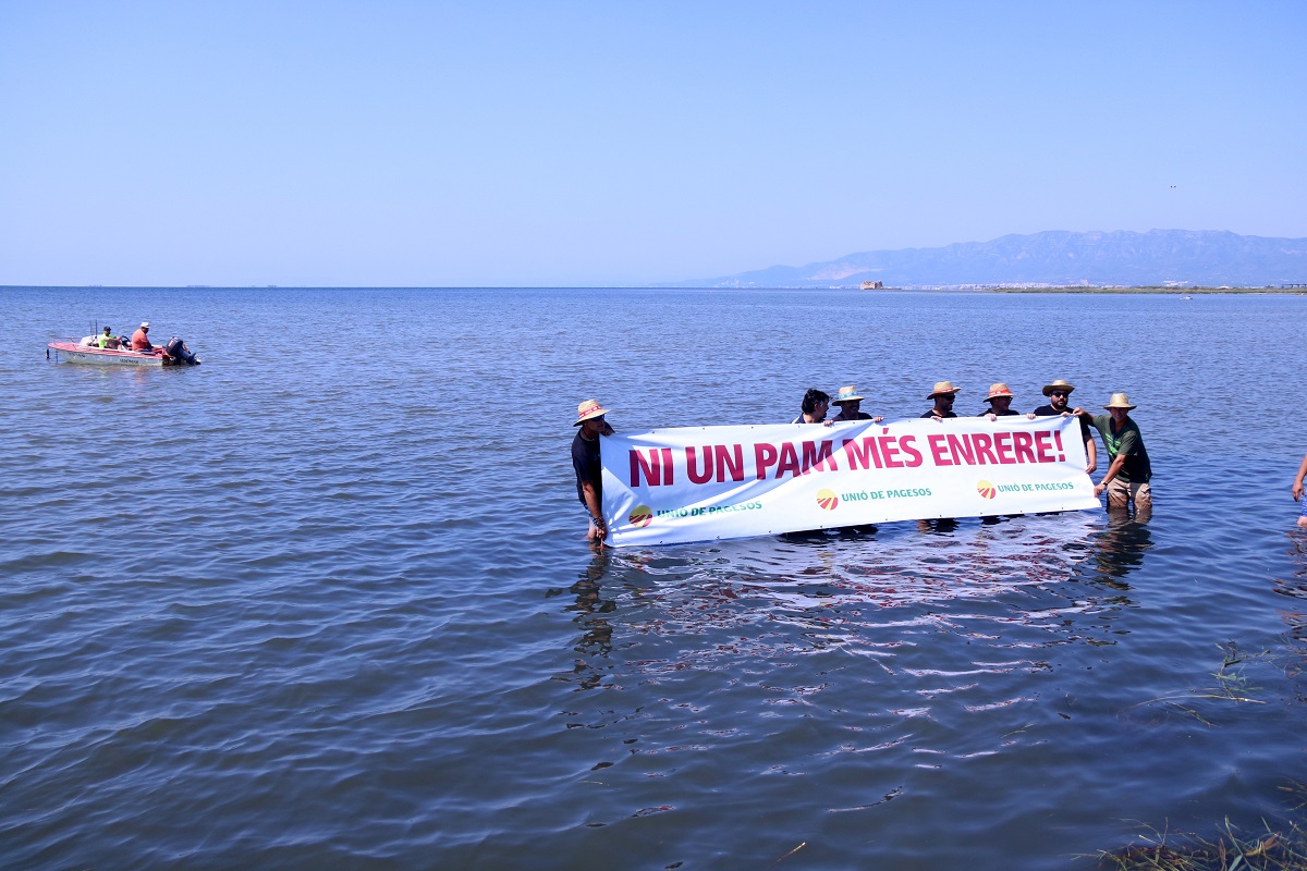 Un grup de militants del sindicat ha entrat a la badia dels Alfacs també amb una pancarta on es podia llegir “Ni un pam més enrere”. El missatge vol expressar també el rebuig del sindicat a l’estratègia de fer retrocedir la línia costanera i ampliar la franja de terreny d’acomodament per contrarestar l’embat dels temporals i l’increment del nivell del mar previst. Un plantejament que terroritza la majoria dels arrossaires que consideren el manteniment de l’actual morfologia deltaica com a “innegociable”. Prenen el cas dels Països Baixos com a gran referent.