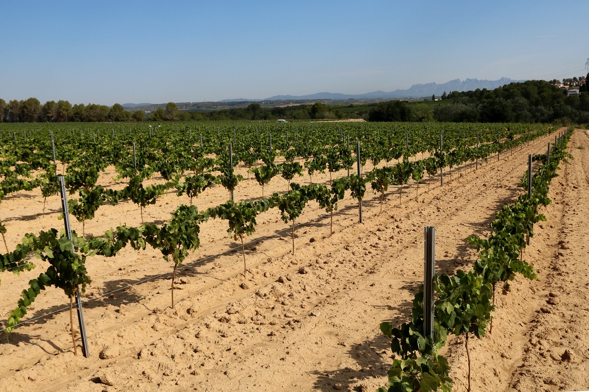 Albert Valldosera i els tècnics viveristes Pol i Enric Regull van aliar-se el passat mes de febrer per plantar 40.000 troncs de cep d’una alçada mai vista abans al Penedès ni enlloc de la península Ibèrica. Amb les 12,5 hectàrees decidien apostar per un nou tipus de conreu després de diversos estius experimentals en què havien testat els pros i contres dels ceps de 80 centímetres. Al final, els beneficis van fer decantar la balança i aquest estiu la vinya ha fet la seva primera floració.