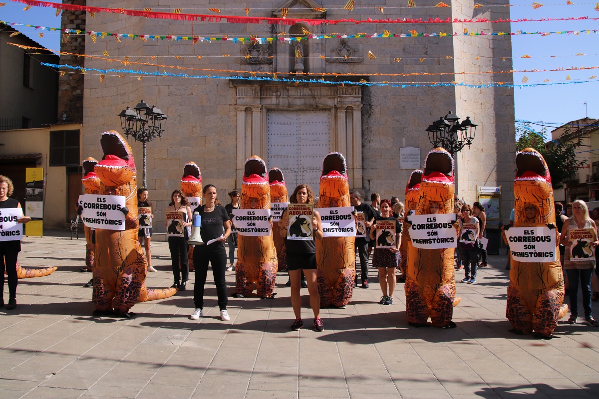 L’acte de protesta va començar a quarts de deu del matí amb la concentració davant l’església de Santa Maria de Vidreres. Amb les disfresses d’alguns participants, l’organització ha volgut “demostrar que els correbous són un acte de la prehistòria”. “De la mateixa manera que no té sentit que hi hagi dinosaures corrent pels carrers del poble durant les festes, tampoc té cap sentit que hi facin córrer vaquetes o bous”, ha detallat la coordinadora de la plataforma Prou Correbous.