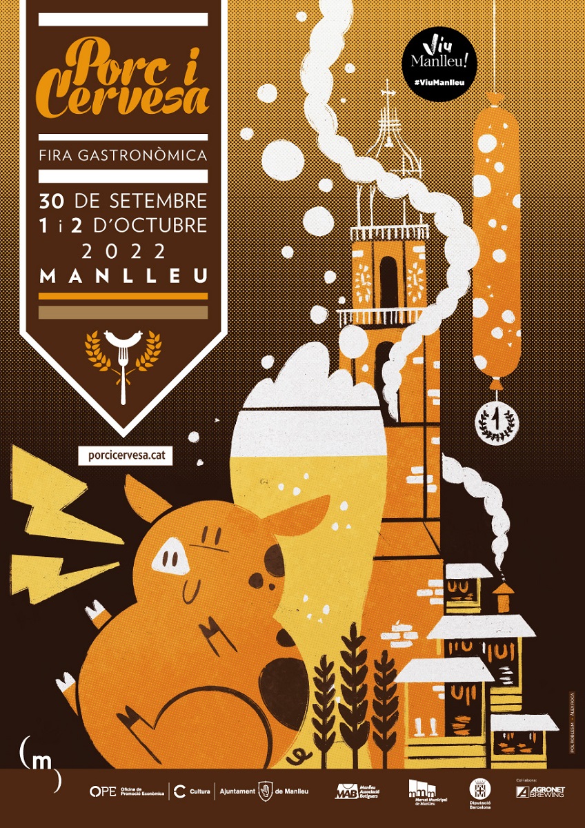 El cartell d’aquesta edició ha estat dissenyat per l’il·lustrador Àlex Roca, que fa una proposta amb els colors de la imatge gràfica de la fira. Hi ha el porc, la cervesa, el campanar de Manlleu, les parades de fusta, els brots d’ordi i un embotit premiat. A nivell d’estil ha donat un acabat fet a mà per solidaritzar-se i posar en valor els paradistes: petits productors artesans de carn i cervesa.