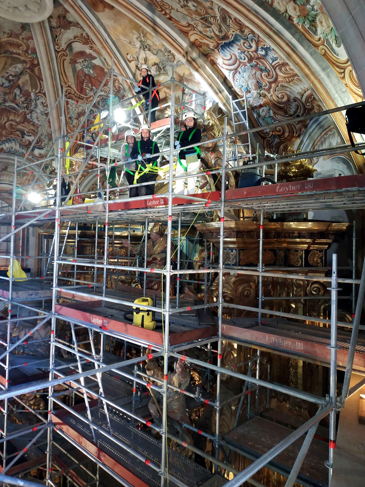 Pel que fa al revers del conjunt retaulístic, s’han col·locat unes plataformes de fusta de cedre per poder accedir a tota la superfície del revers del retaule i poder dur a terme posteriors controls d’estat de conservació. La característica principal de la fusta de cedre que la fa adient per a aquesta intervenció és que de forma natural és resistent a l’atac de fongs i d’insectes, molt estable i fàcil de treballar. Per eliminar la pols acumulada s’ha procedit a una neteja mecànica de la pols superficial amb aspirador i paletina i a una neteja hidroalcohòlica de tota la superfície.