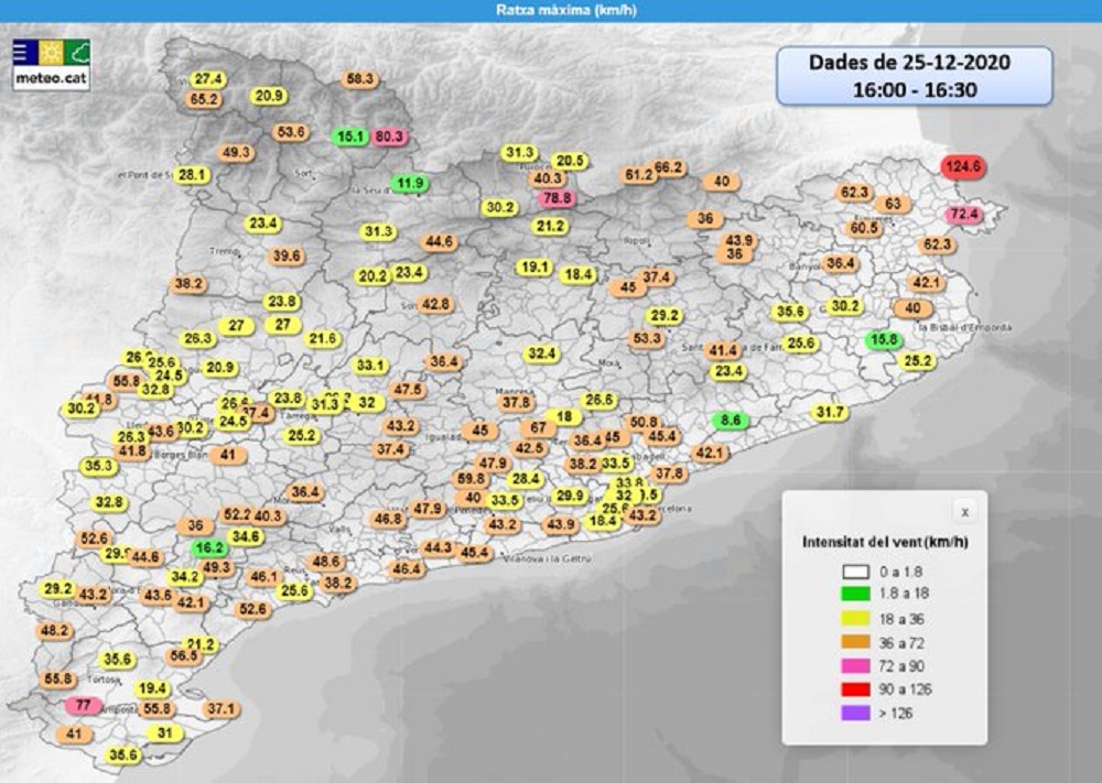 Els Bombers de la Generalitat han atès uns 60 avisos pel vendaval entre el dia de Nadal i aquest Sant Esteve. Cap incident ha estat greu, tot i que alguns subministres s’han pogut veure afectats localment per la caiguda de branques i pals de llum i telèfon. La majoria de serveis de Bombers s’han concentrat a la regió de Girona, sobretot a l’Alt Empordà, on les ratxes de tramuntana han superat els 140 km/h. Portbou (145 km/h), Roses (101,5 km/h), Navata (95,4 km/h) i el pantà de Darnius-Boadella (110,5 km/h) no registraven un vent tan fort des del gener-febrer del 2019, segons el Servei Meteorològic de Catalunya (SMC). Al Camp de Tarragona, destaquen registres com els 111 km/h de l’Hospitalet de l’Infant o els 101 km/h de l’Albiol.