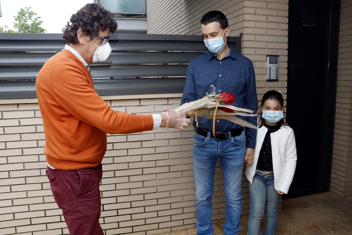 L’Oriol Sala és un veí de Tàrrega que ha fet una comanda de tres roses a Flors Català. A quarts d’onze el Xavier ha trucat al timbre de casa seva i l’Oriol ha baixat amb la seva filla petita per recollir les tres roses. Ha explicat que Sant Jordi és un “dia molt important” i que la tradició de donar la rosa “a les dones que estimem no es pot perdre”. Ell en té tres a casa i cada any passava per la botiga a buscar-les però aquest any ha optat pel servei a domicili, per seguir amb la tradició sense haver de sortir de casa i garantir així la seguretat per frenar el coronavirus.