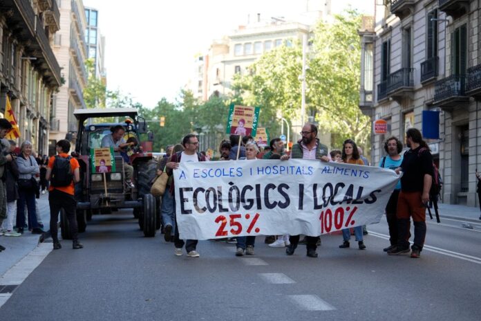 El cor de Barcelona s’ha convertit aquest dijous en el crit d’alerta d’un sector que se sent traït per les institucions. Sota el lema “A escoles i hospitals, aliments ecològics i locals”, Unió de Pagesos (UP) i l’Assemblea Catalana per la Transició Ecosocial han assenyalat directament la Generalitat per la seva “deixadesa de funcions” en no imposar criteris de proximitat en la compra pública alimentària.