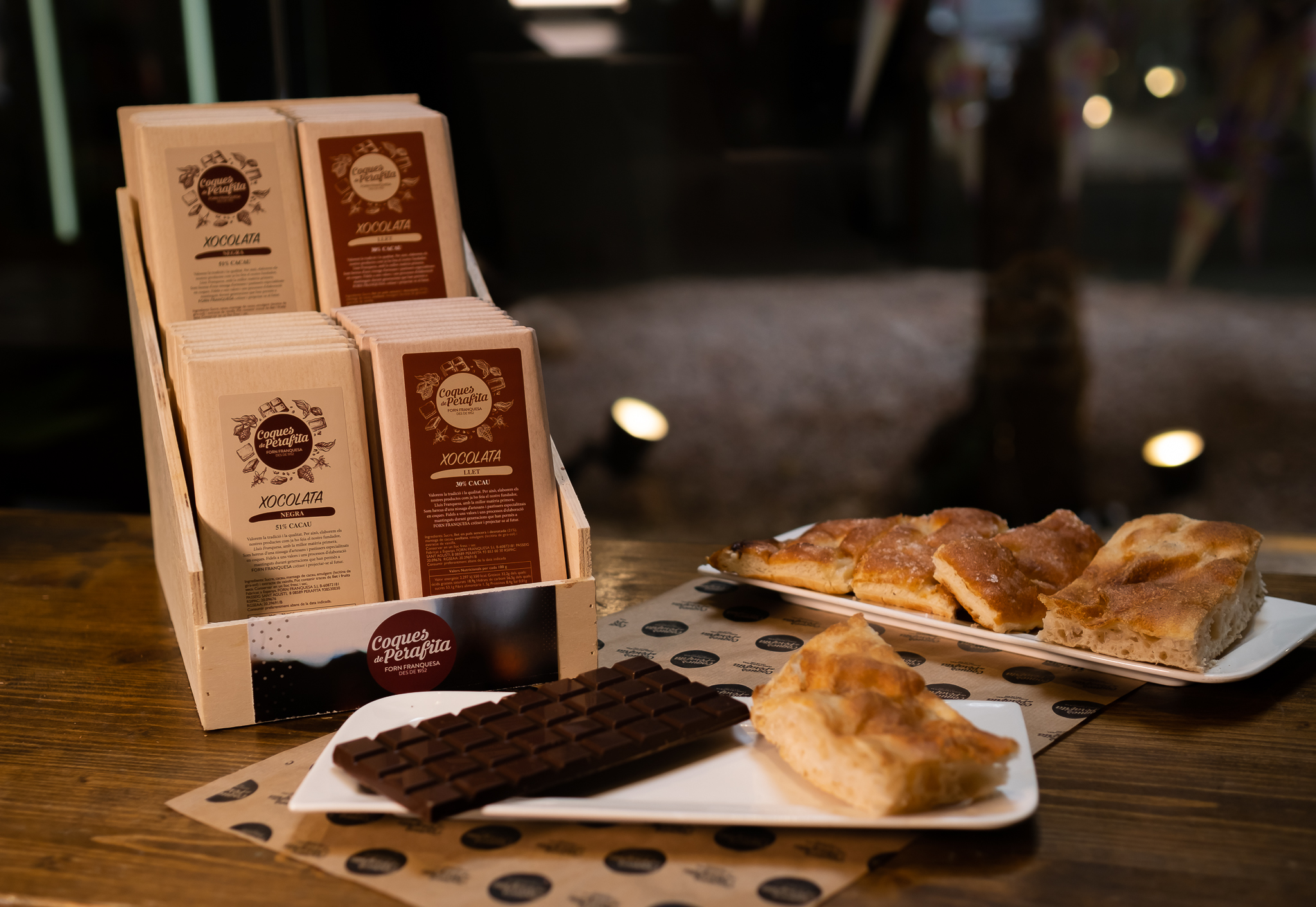 La nova gamma de xocolates gourmet es ven amb la marca Coques de Perafita i dos formats diferents: per una banda, la xocolata negra i la xocolata amb llet, que es presenten amb rajoles de 100 grams, i, per una altra, la crema de xocolata per untar, disponible en envasos de 200 grams, que és la que porten les coques de xocolata. “Tant l’una com l’altra són ideals per acompanyar les nostres coques de forner i de sucre, ja sigui per esmorzar, berenar o a les postres, o també amb un tros de pa de pagès”, diu Franquesa. La xocolata negra té un 51% de cacau i la xocolata amb llet un 30% i es presenten amb uns expositors de fusta.