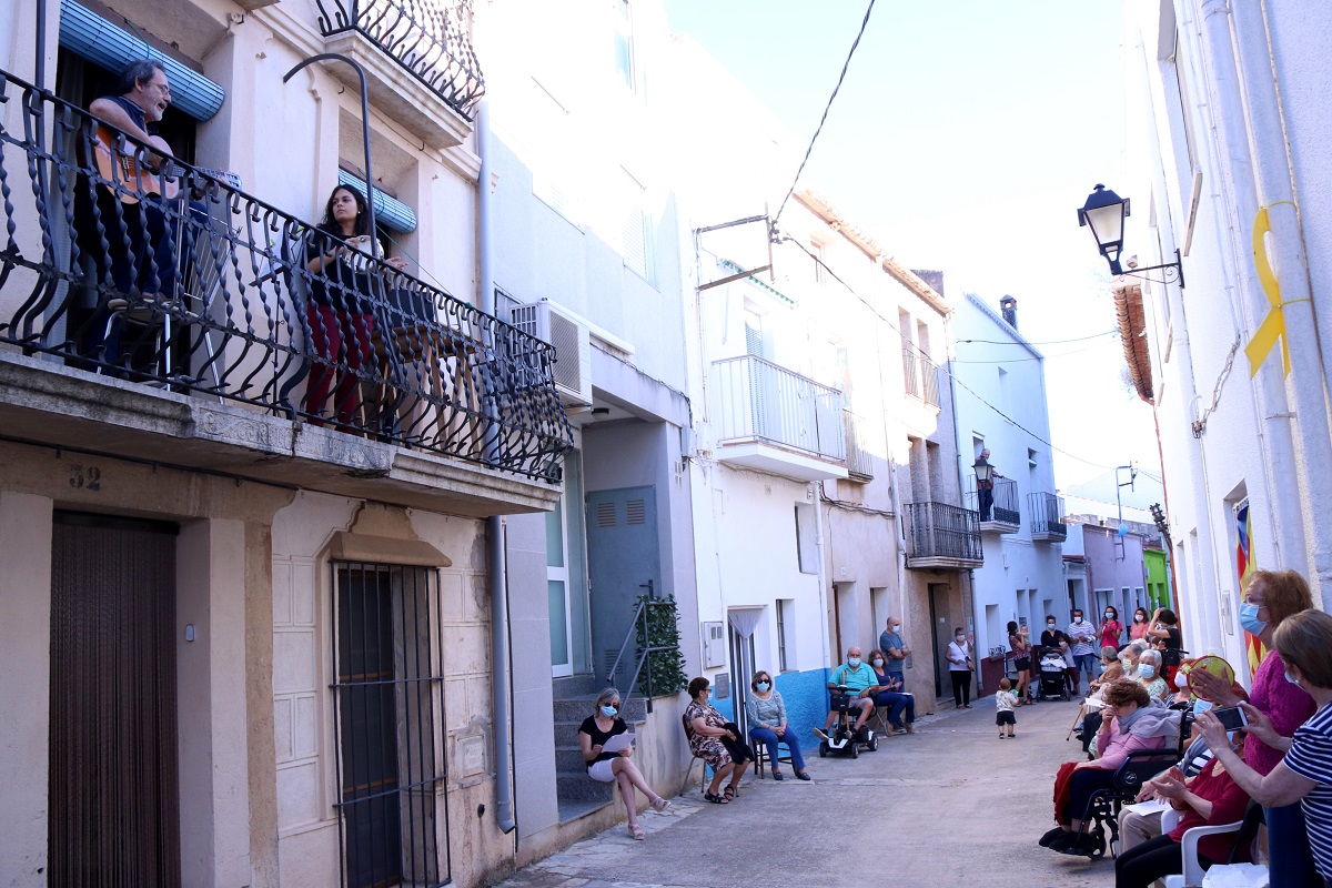 Quan encara falta una estona perquè toquin les set de la tarda alguns avis i àvies ja esperen, asseguts amb les seves cadires sobre la vorera i la mascareta posada, l’inici del recital de jotes. A les proximitats del balcó que fa les funcions d’escenari van arribant més persones, que s’arrengleren ordenadament i de forma espaiada al llarg del tram de carrer. Al final, són més d’una trentena i molt poques s’han deixat la mascareta a casa.