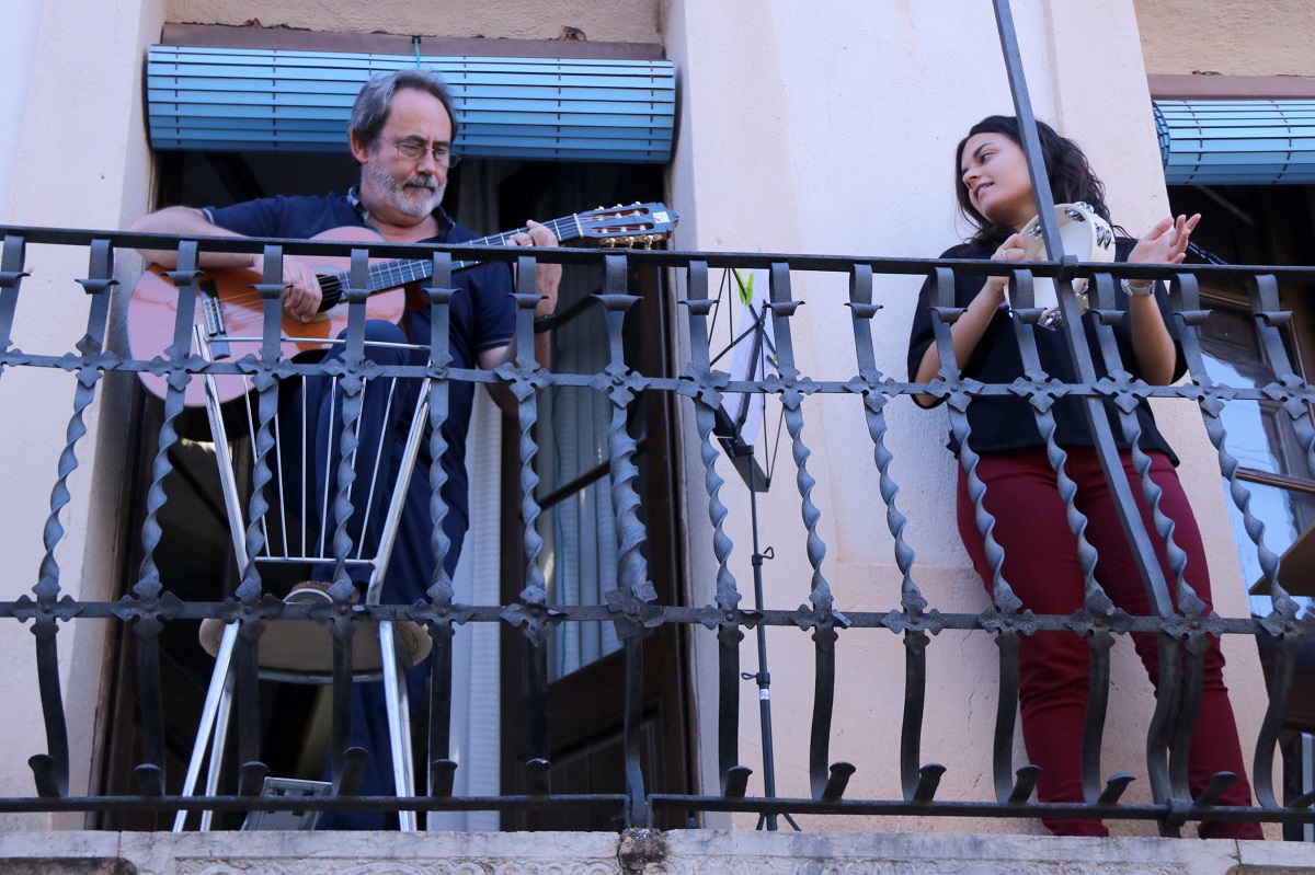 “Confinats, confinats, van començar a venir quatre o cinc persones. Després se n’anaven afegint. Alguns es posaven al cantó, una mica separats, però sempre amb la mascareta i guardant força bé la distàncies, tot i que a Freginals hem tingut la sort de no tenir cap malalt”, relata el mateix Fernández. Pocs minuts després de l’hora establerta, amb la guitarra a les mans, apareix al balcó amb la seva filla Núria, que l’acompanya a la percussió i disparant alguns sons pregravats. Serà l’última actuació que fan des de la casa, que és propietat de la família, després que la millora de la situació sanitària hagi permès flexibilitzar la rigidesa del confinament.