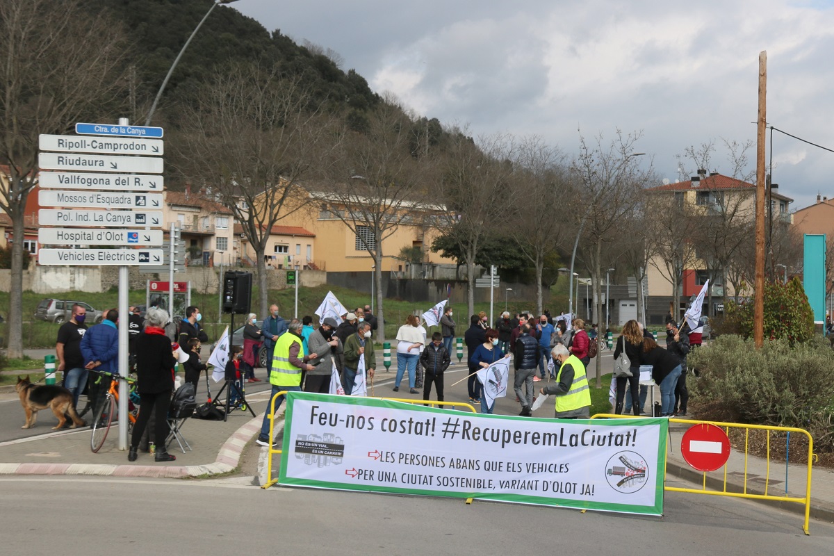 Una trentena de veïns han col·locat una pancarta just a l’inici de la carretera de la canya on demanaven el suport dels seus conciutadans i reclamaven “recuperar la ciutat”. ‘Les persones abans que els vehicles. Variant d’Olot ja’, s’hi podia llegir.