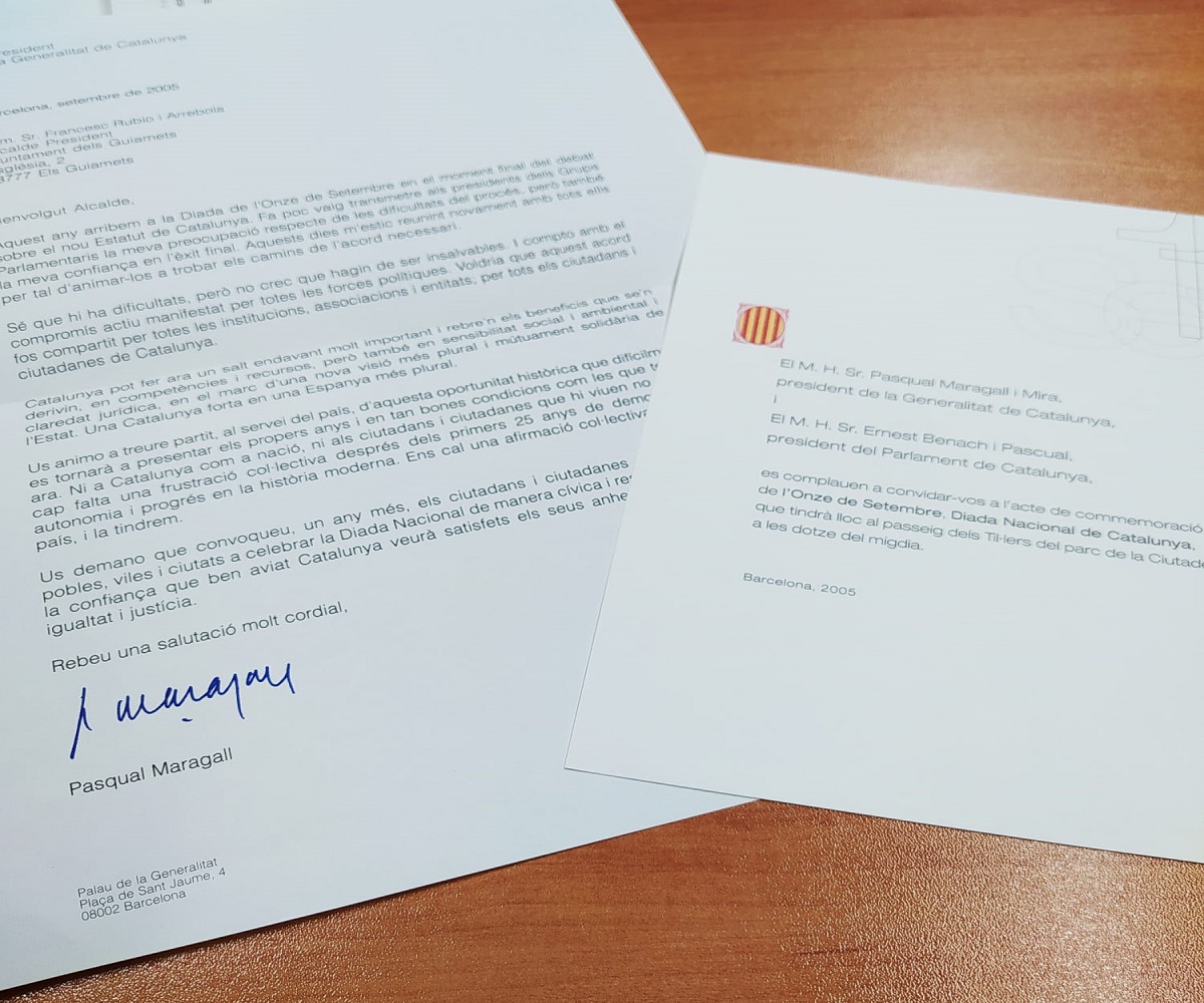 Sorpresa a l’Ajuntament dels Guiamets (Priorat) després de rebre fa uns dies una carta oficial de la Generalitat convidant-los als actes de la Diada de l’any 2005. El sobre contenia una carta signada pel llavors president, Pasqual Maragall, instant el llavors alcalde del municipi, Francesc Rubio, a animar el veïnat perquè celebrés l’Onze de Setembre en el context del debat de l’Estatut. La missiva anava acompanyada de la invitació, signada també pel llavors president del Parlament, Ernest Benach, per participar en els actes organitzats al parc de la Ciutadella aquella jornada de fa quinze anys. La recepció de la carta, tramesa per Correus i amb la inscripció “urgent” al sobre, ha estat acollida a la població amb sorpresa i, sobretot, humor.