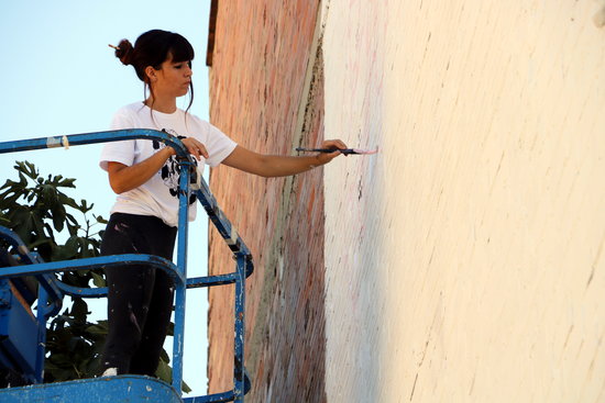 Dejuan va començar el mural dijous amb els treballs previs que van consistir en pintar de color blanc tot el mur. Aquest divendres desenvoluparà les figures femenines que el conformaran.