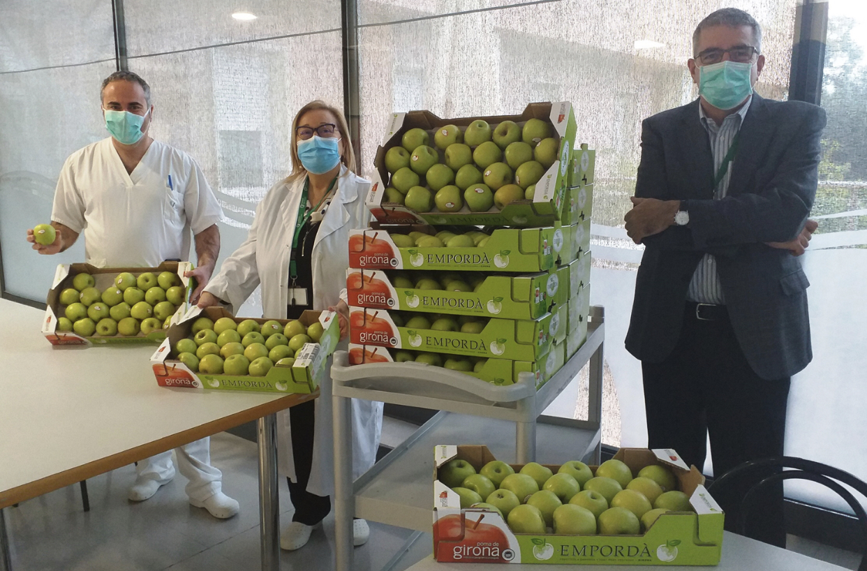 Els productors de la Indicació Geogràfica Protegida (IGP) Poma de Girona, formada per les empreses Girona Fruits, de Bordils (Gironès),Giropoma Costa Brava, d’Ullà (Baix Empordà); i Fructícola Empordà, de Sant Pere Pescador (Alt Empordà), han repartit aquest dijous 300 kg de pomes a professionals de l’hospital Trueta de Girona i els de Figueres i Palamós. Amb aquesta acció solidària volen reconèixer i donar suport a l'”incansable esforç” dels professionals davant la pandèmia de la covid-19.