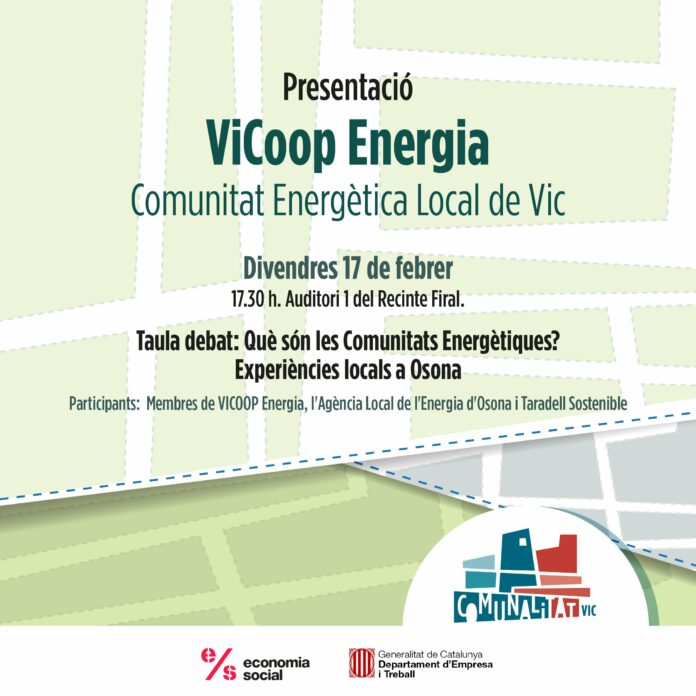 Avui divendres 17 de febrer es presenta, en el marc de la Fira de l’Energia i la Construcció Sostenible, la primera comunitat energètica de Vic. La presentació es farà a 2/4 de 6 de la tarda a l’Auditori 1 del Recinte Firal a través d’una taula de debat amb representants de VICOOP, però també de l’Agència Local de l’Energia d’osona i de Taradell Sostenible. En l’acte, a part de presentar la nova cooperativa energètica vigatana, s’explicarà què són les comunitats energètiques i altres experiències locals a Osona, comarca pionera en la implementació d’aquest model.