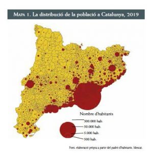 «Entre els anys 1900 i 1950 Catalunya perd gairebé la meitat dels habitants que viuen en municipis de menys de 100 hab./km2. Aquest procés, vinculat a la segona revolució industrial, va acompanyat d’un gran creixement poblacional i té uns efectes poc marcats en la població dependent de l’agricultura, en uns anys on rural i agrari es podien considerar sinònims.»