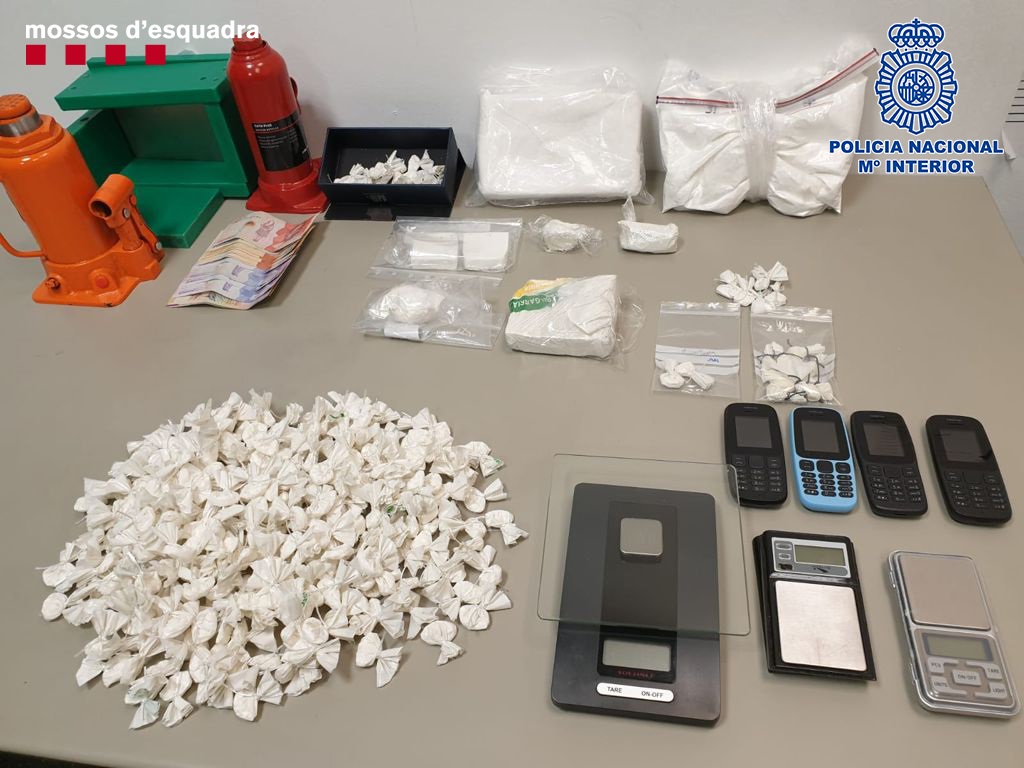 També es van comissar 7.425 euros, dispositius electrònics i informàtics i una sèrie d’estris per treballar la droga com ara gats hidràulics i motlles per premsar la droga i facilitar-ne el transport a més de bàscules de precisió i material per preparar les dosis per a la seva venda final.