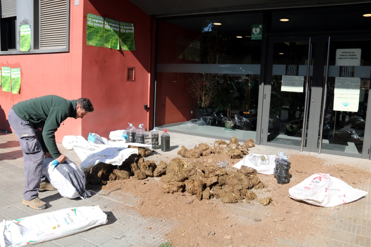 Després de la trobada, membres d’Unió de Pagesos han abocat diversos sacs amb adobs orgànics i han dipositat garrafes amb purins a l’entrada a l’edifici que acull la seu del Departament d’Acció Climàtica a la capital del Segrià. D’aquesta manera, han volgut visibilitzar el malestar per la “inacció” tant del govern català com l’espanyol davant les dificultats que viuen pagesos i ramaders.