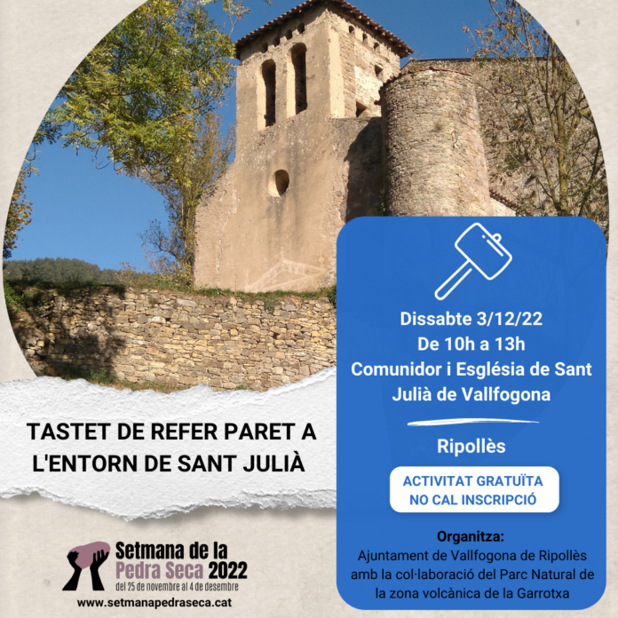 Amb el suport del Parc Natural de la Zona Volcànica de la Garrotxa, l’Ajuntament de Vallfogona de Ripollès organitza per segon any una activitat dins de la Setmana de la Pedra Seca. Es tracta d’un taller pràctic, obert a tot el públic, on sota la direcció de l’enginyer Joan Montserrat es referà un tros de paret seca al voltant de l’església de Sant Julià i el camí ral. Es recomana anar equipats amb guants i roba per treballar. L’any passat es va fer una sortida de reconeixement de construccions de pedra seca acompanyats del mateix Montserrat i del fotògraf Pep Sau.